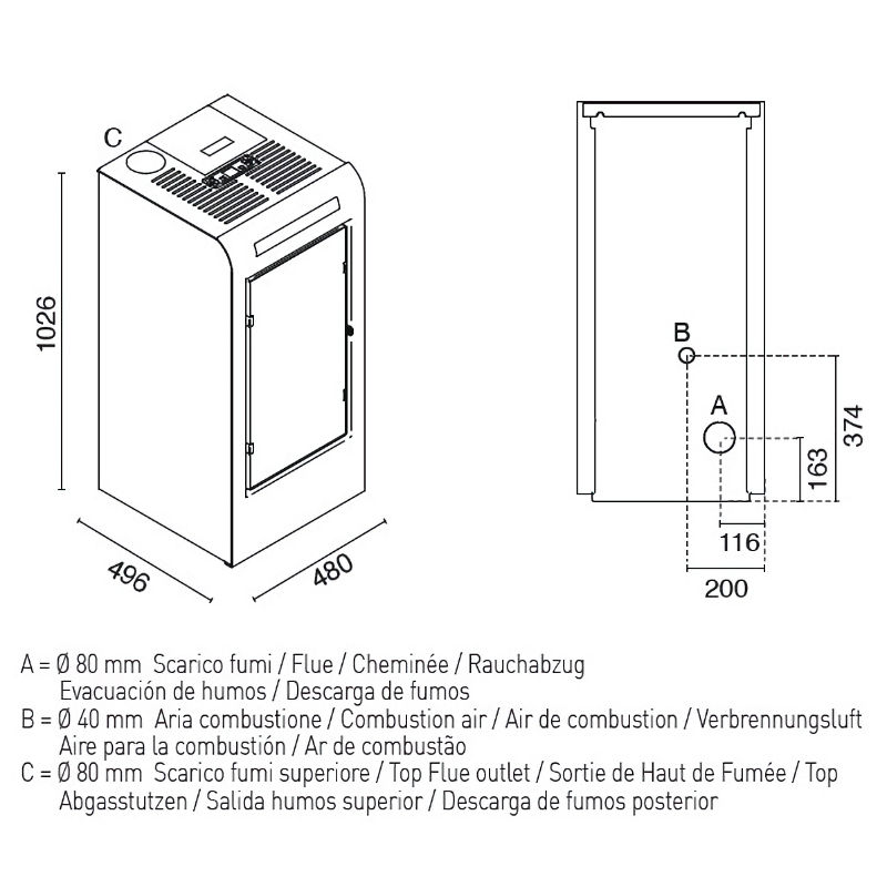 De Rosa is een nieuw model pelletkachel met grote glazen deur met donker geëtst glas. De Eva Calor Rosa heeft zowel een boven als achter aansluiting voor rookgas.